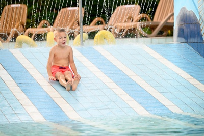 The indoor children's pool and sauna area is a real family complex. The 3,000 m2 of adventure pools offer a full range of adventure elements such as indoor slides, a waterfall wall, waterfall wall, whirlpools, hot tubs, bouncers, etc.